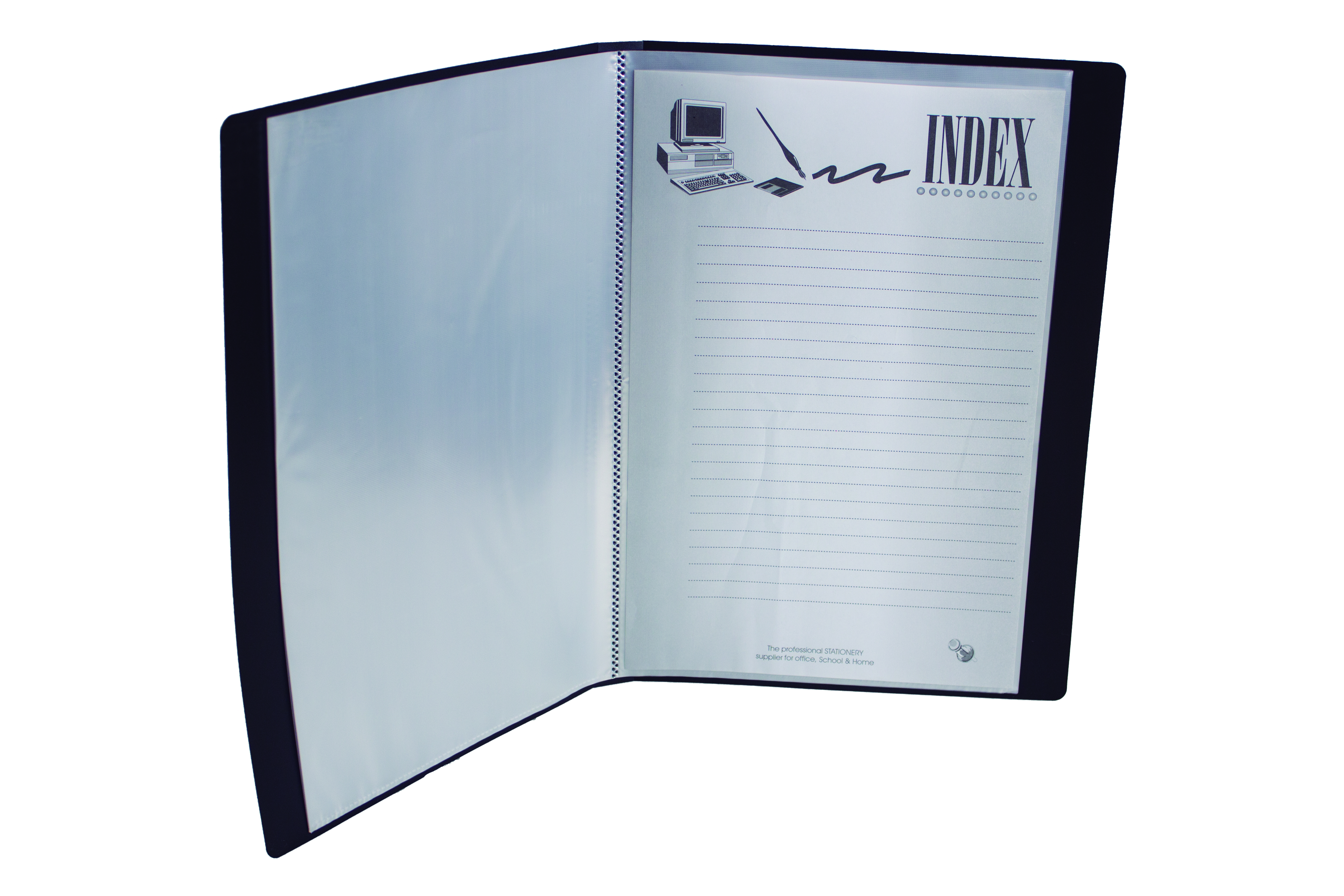 Carpeta con tapas de polipropileno rígido opaco de 600 micrones de espesor y folios fijos en su interior. Permite dividir y organizar por diferentes temáticas.